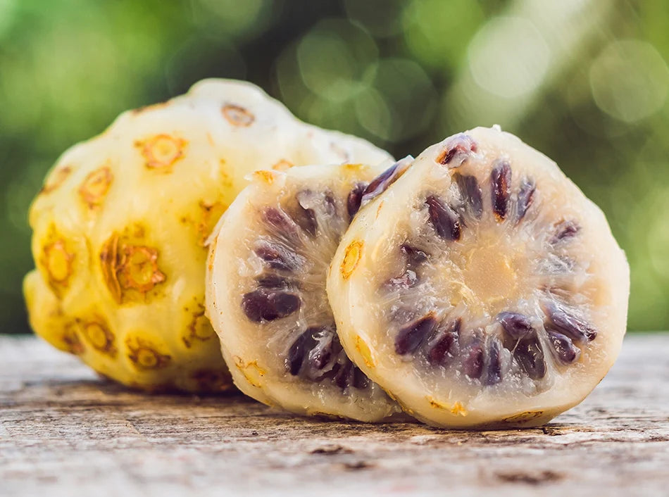 Noni (pronounced NO-nee) is a lumpy, mango-sized fruit that is yellow in color. It’s very bitter and has a distinct odor that is sometimes compared to stinky cheese.